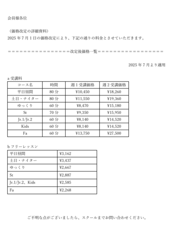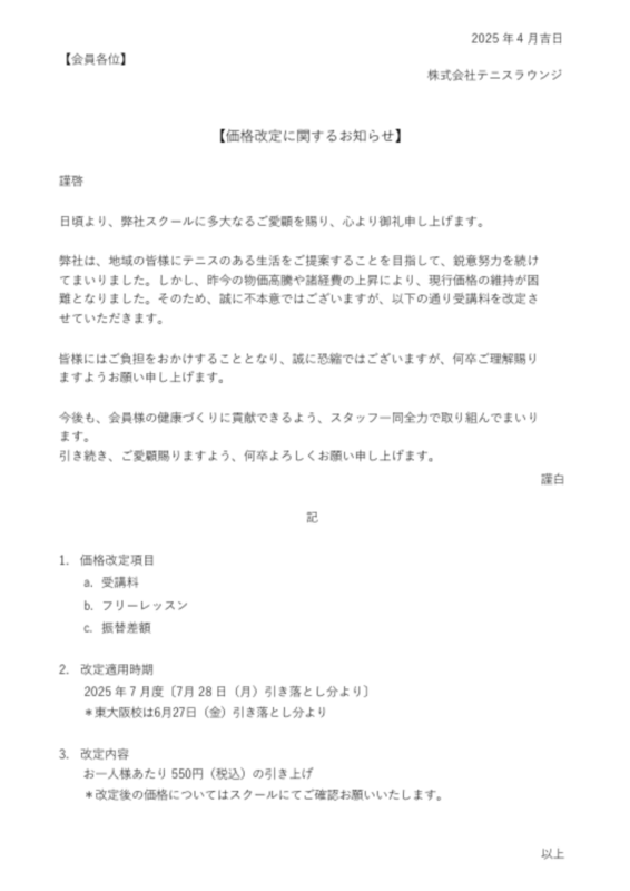 日頃よりテニスラウンジ糸満に多大なるご愛顧を賜り、心より御礼申し上げます。 この度は受講料を含めたサービスの価格改定について謹んでお願いしたく、ご案内申し上げます。 詳細は添付画像にてご確認ください。