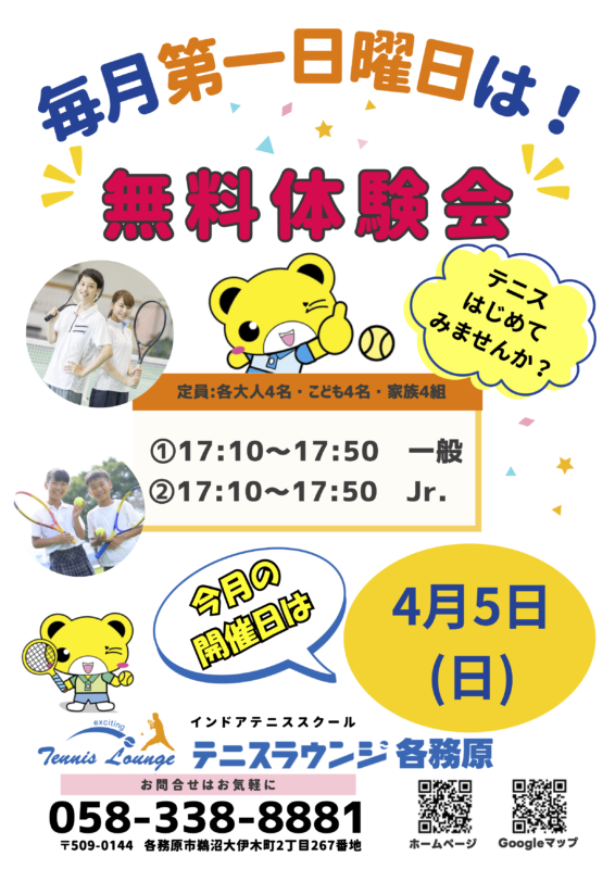 4月は新生活がスタート☺️ 新しい習い事にテニスを始めてみませんか❓ お申し込みは下記の電話番号又は、メールにてお申し込みください🎾