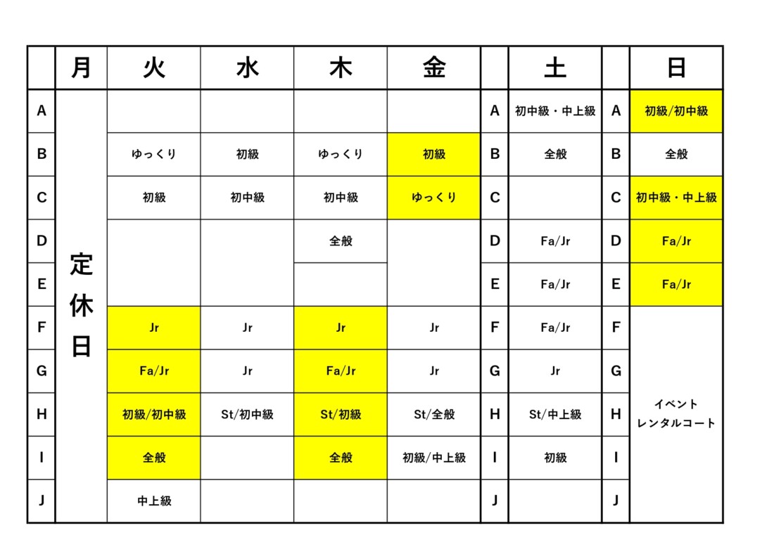 火曜日(午後)、木曜日(午後)、金曜日(午前)、日曜日にいます!(黄色の枠の時間でレッスンしています!)