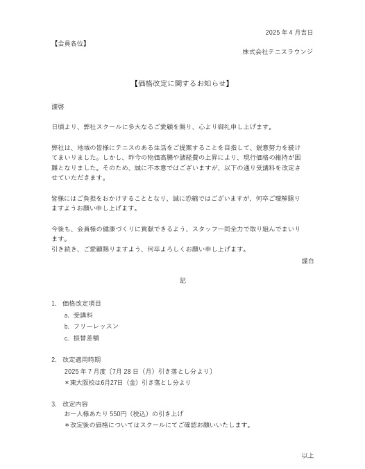 価格改定のお知らせ