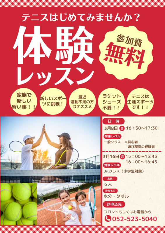 テニスをやったことがない方~少し経験がある方などが対象です。