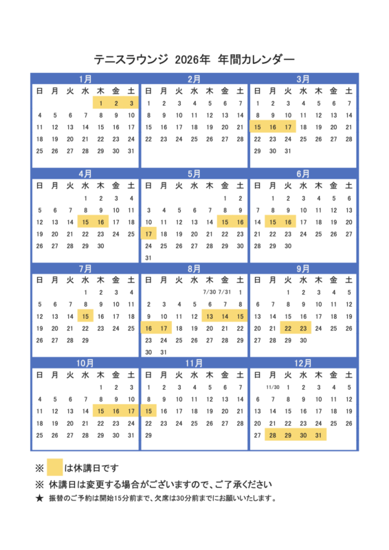 2025年・2026年 スクール年間カレンダー