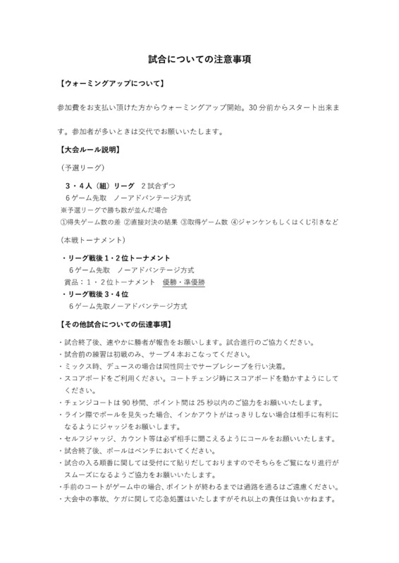 (ペアを変更してもエントリー不可)。但し、優勝した場合でも別のカテゴリー(男子シングルス大会、女子ダブルス等)へのエントリーは可能です。