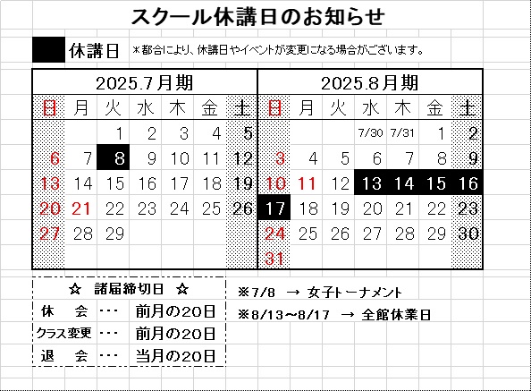 また、休会届け・クラス変更届け・退会届けの締切は20日までになります 。