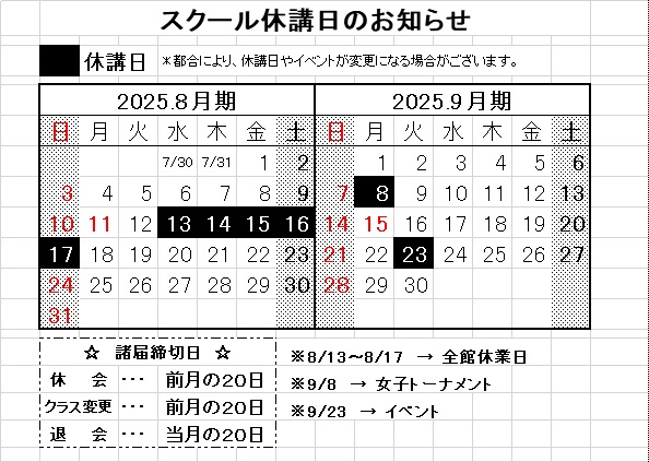 スクール休講日のお知らせです!