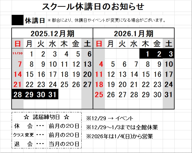 12月のスクール休講日は
