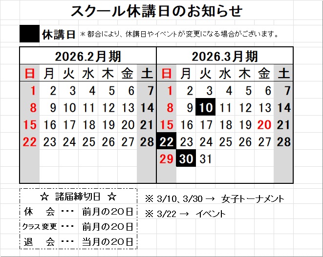 スクール休講日お知らせ(2026年2月)