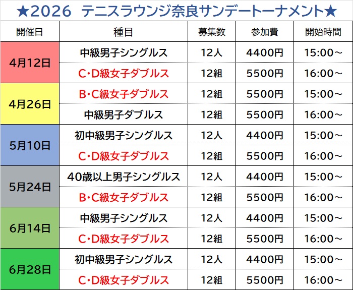 テニスラウンジ奈良サンデートーナメント日程のお知らせです!
