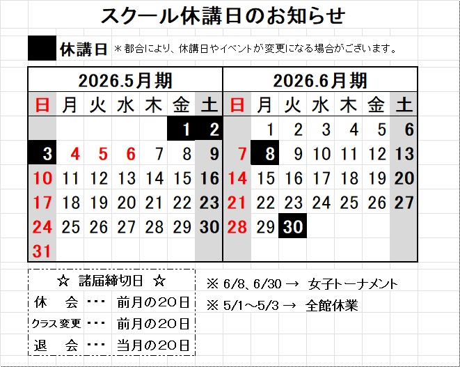 スクール休講日とGWのお休み(全館休館日)のお知らせです!