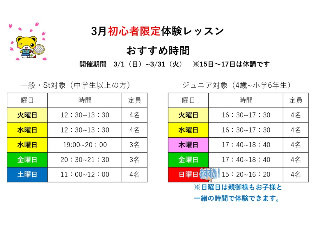 テニスのご経験のない方はこちらがお薦め!お申込み・お問い合わせはお気軽に