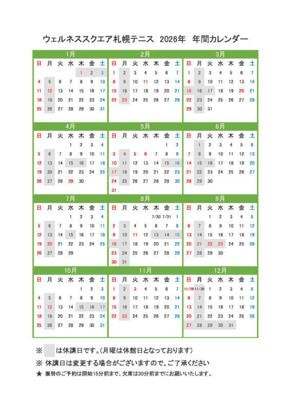 🎾ウェルネススクエア札幌 2026年テニススクール休講カレンダー